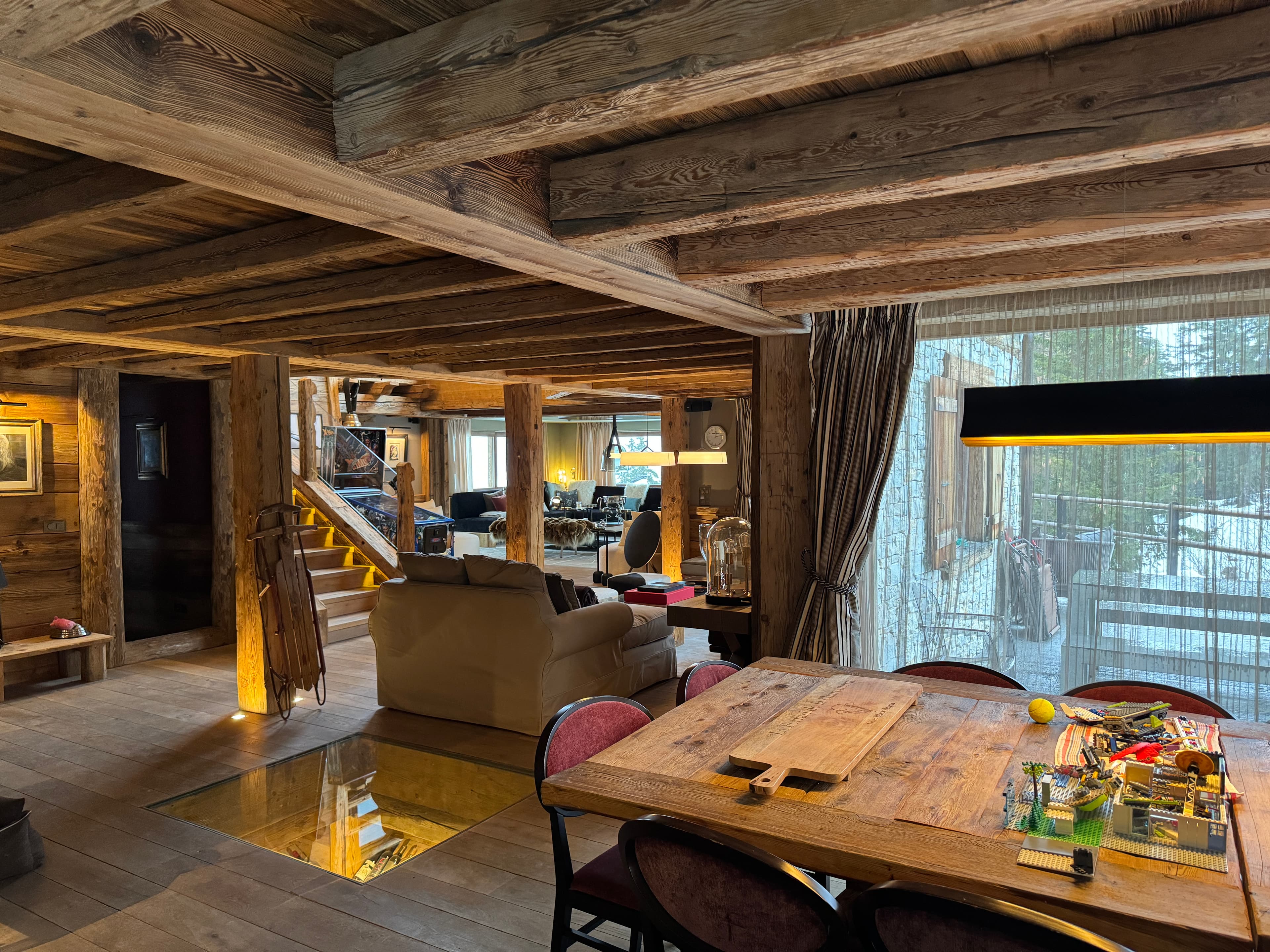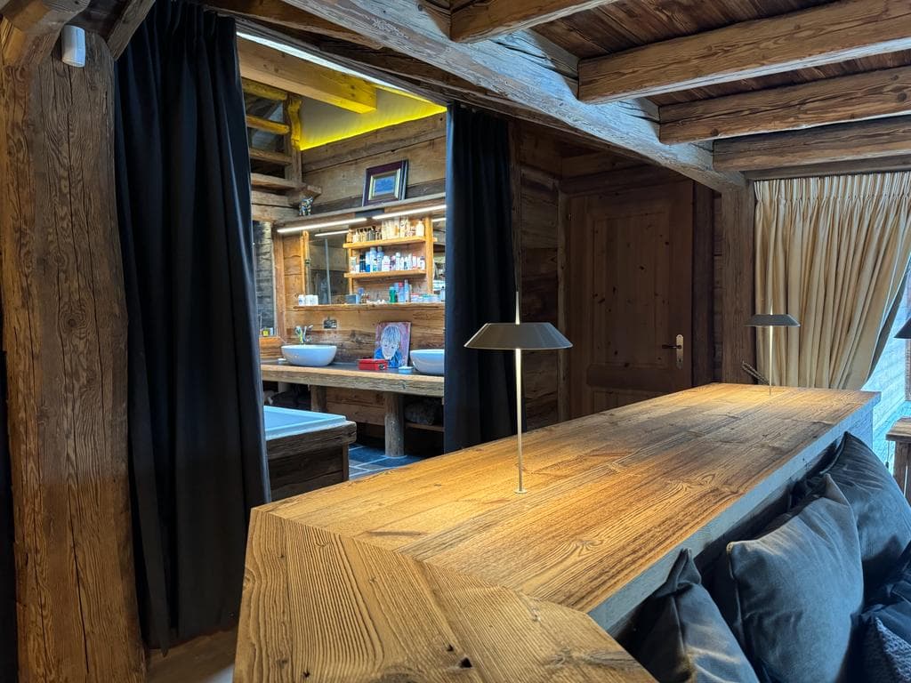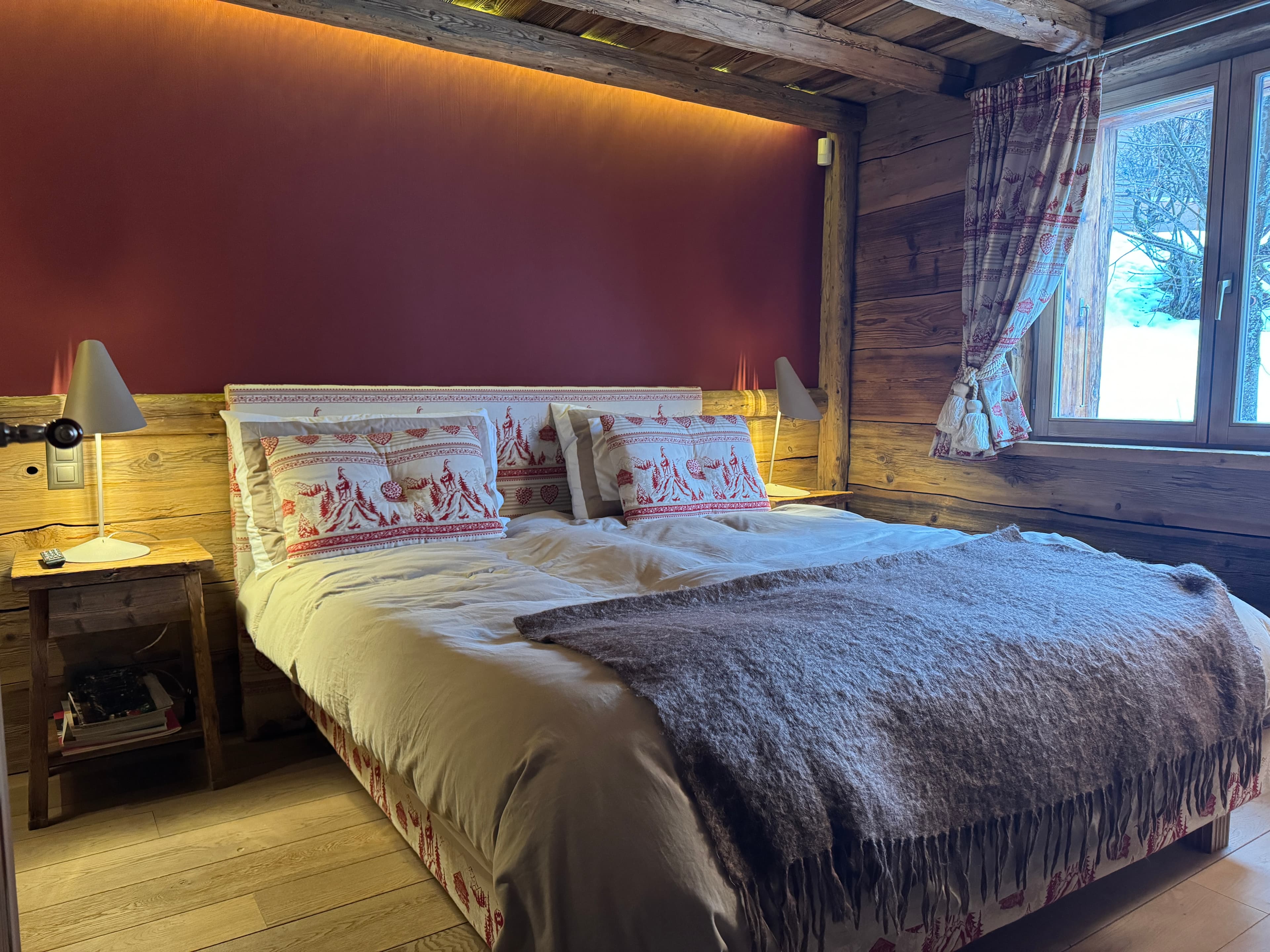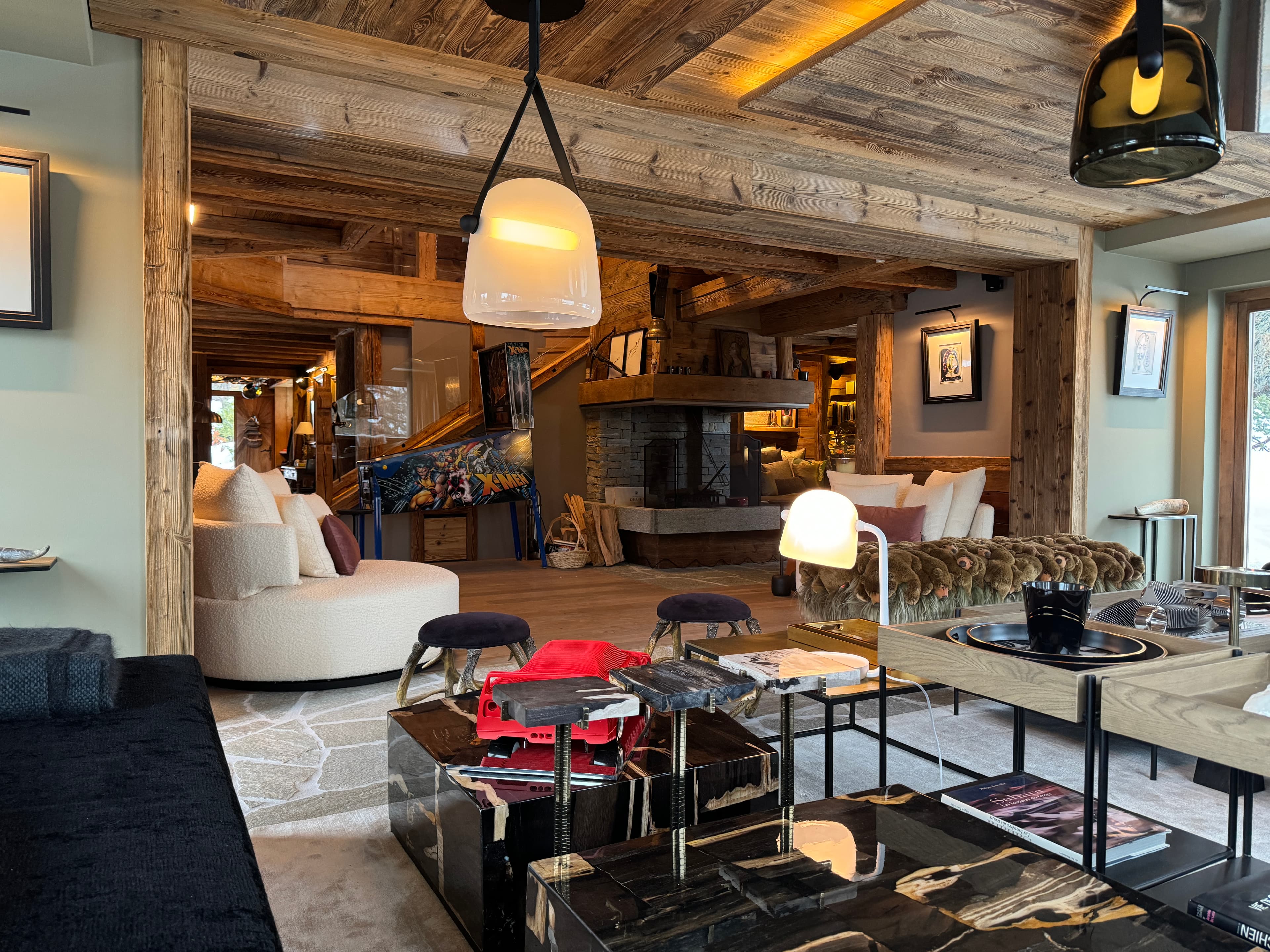 Chalet Kadelpapéo Plusieurs niveaux, plusieurs ambiances, le chalet se déploie comme un récit. Vieux bois et charpente apparente posent le cadre ; le mobilier de créateur, les œuvres d'art et un flipper vintage en font autre chose. Le rez-de-chaussée s'organise en espaces fluides : cuisine ouverte sur la salle à manger, salon, salon TV et véranda suite à un aggrandissement. Chaque niveau développe ensuite sa propre atmosphère, des chambres aux murs rouge bordeaux et boiseries d'époque qui jouent la carte du chalet traditionnel assumé. Les détails contemporains ponctuent l'ensemble sans jamais effacer l'âme du lieu.