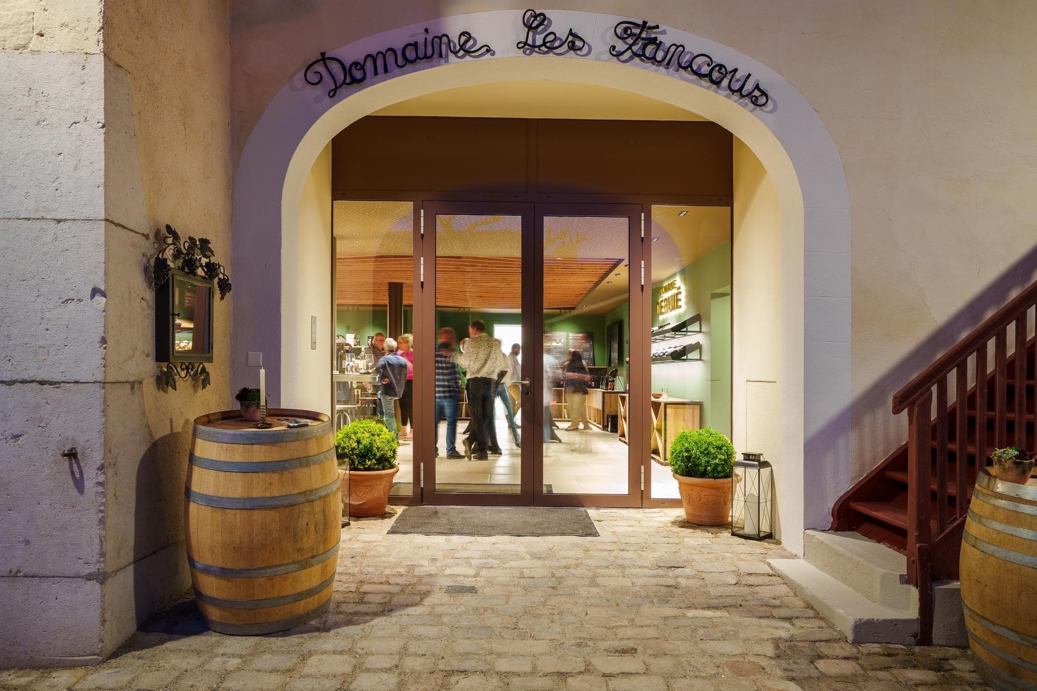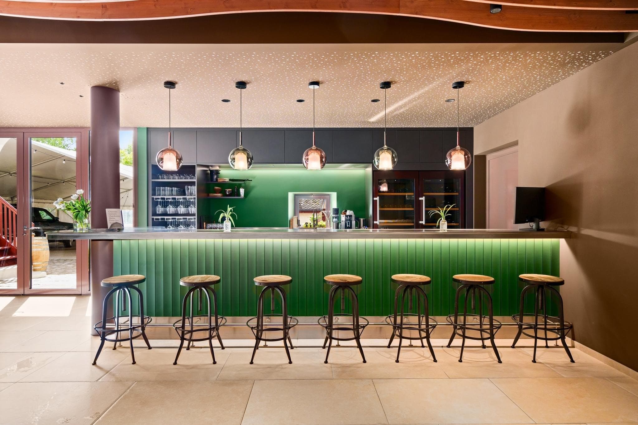 Domaine Debluë Aménagement intérieur d'un carnozet. Au cœur du domaine, l'espace de dégustation et de restauration s'articule autour du vert bouteille, couleur signature qui habille le bar, les murs et les étagères d'exposition. Un plafond en lames de bois cintrées court sur l'ensemble et unifie les volumes. La cave à barriques, visible depuis la salle par une paroi vitrée, s'intègre au décor comme un élément à part entière. Les parois vitrées en fait un élément central, rappelant en permanence l'origine du lieu. Les détails racontent l'identité du domaine : un pressoir ancien reconverti en table de dégustation, une auge en pierre brute transformée en vasque, des suspensions en verre soufflé. Ancien et contemporain s'y côtoient sans artifice.
