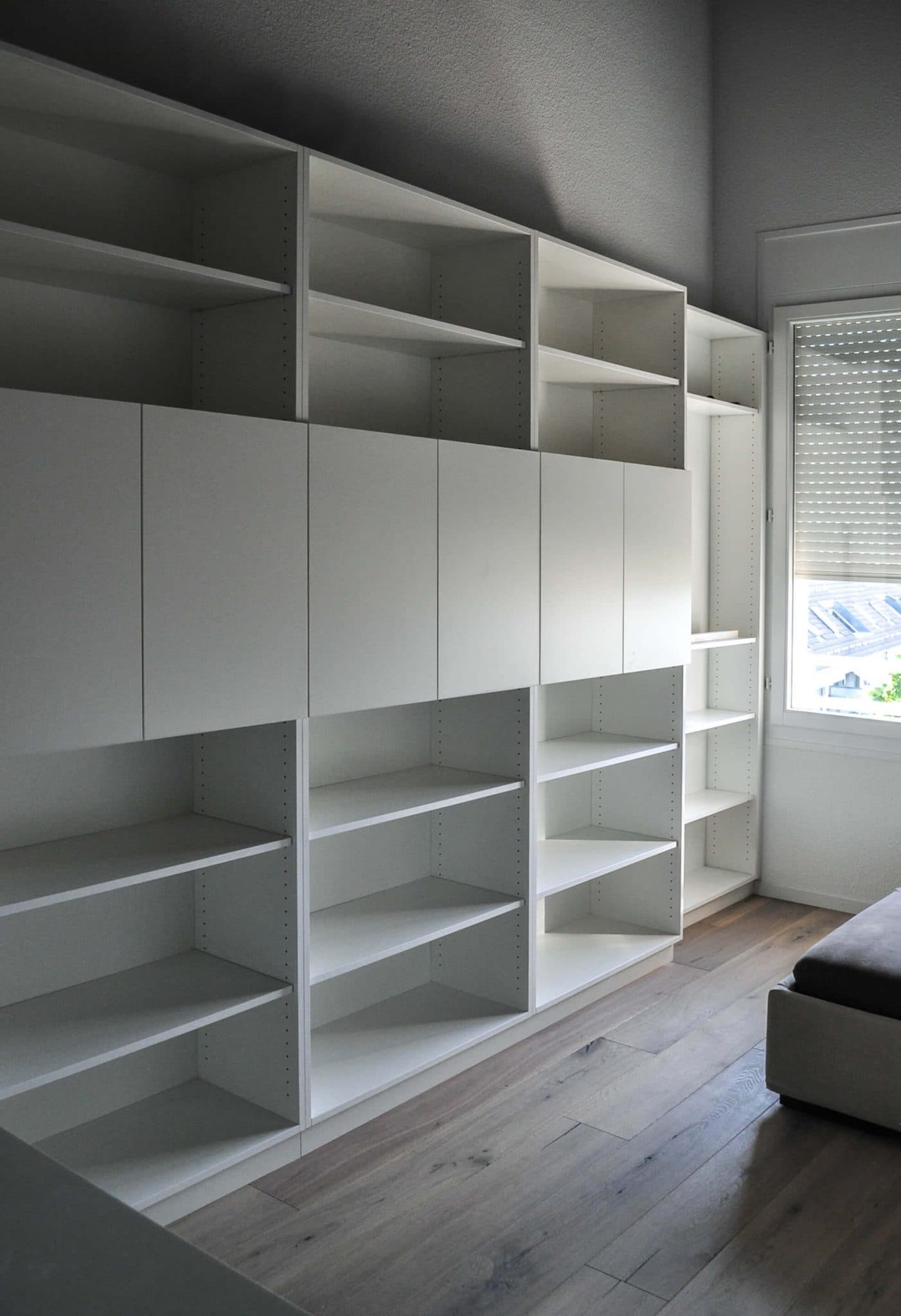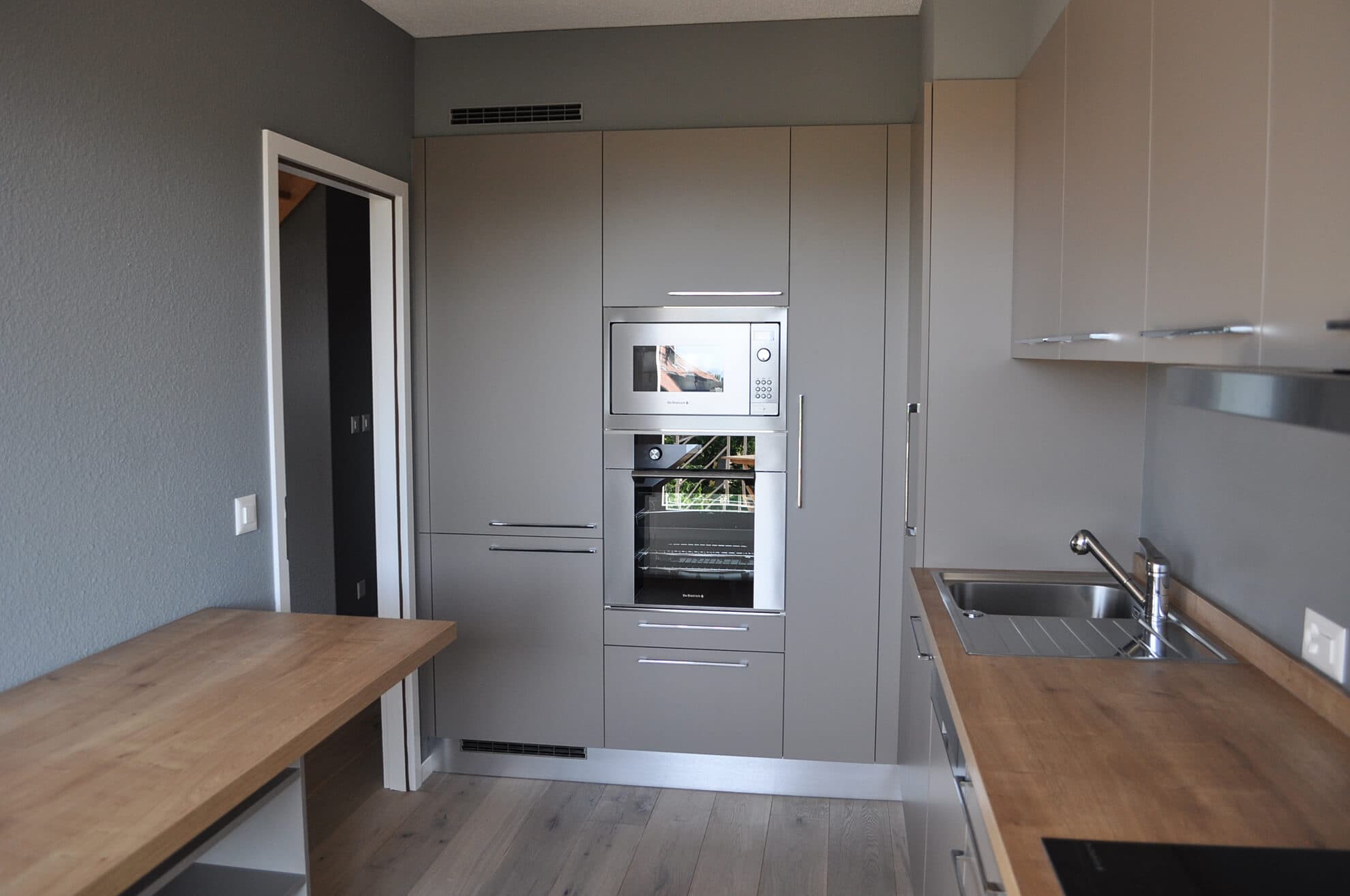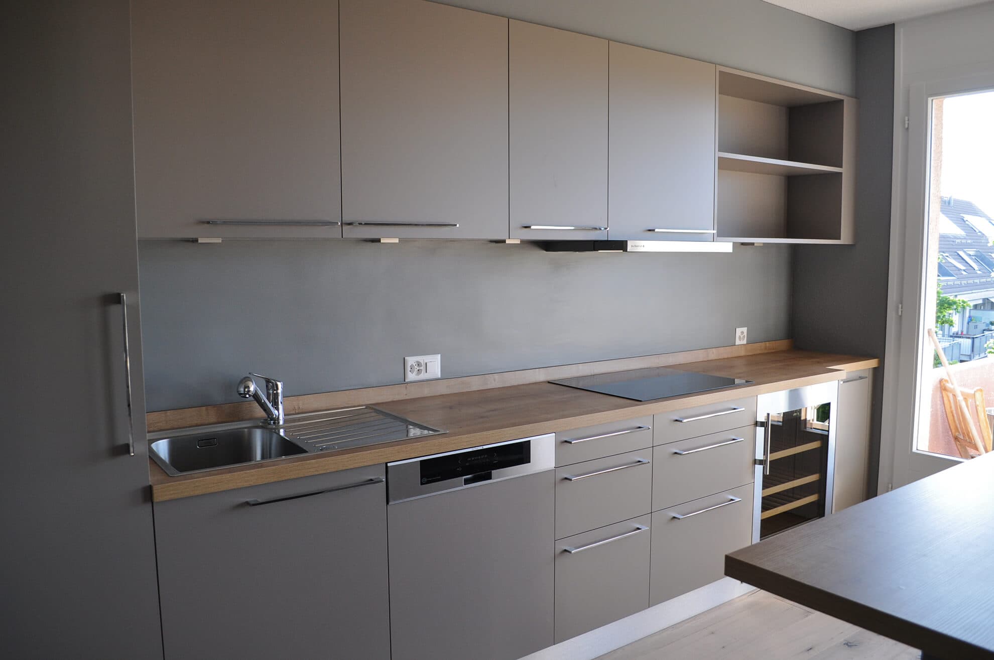 Duplex Zambala Rénovation complète d'un duplex des années 1970 : sol en parquet chêne clair, murs repeints en gris anthracite et escalier en bois naturel avec balustres en câbles inox. La cuisine allie façades grège mat et plan de travail en chêne, avec colonne intégrée four et micro-ondes et cave à vin encastrée. Le dressing sous combles épouse la pente du toit, avec tiroirs et étagères sur mesure en blanc, éclairé par un velux. Les rangements de chambre sont traités en bibliothèque pleine hauteur blanche, avec portes et niches ouvertes.