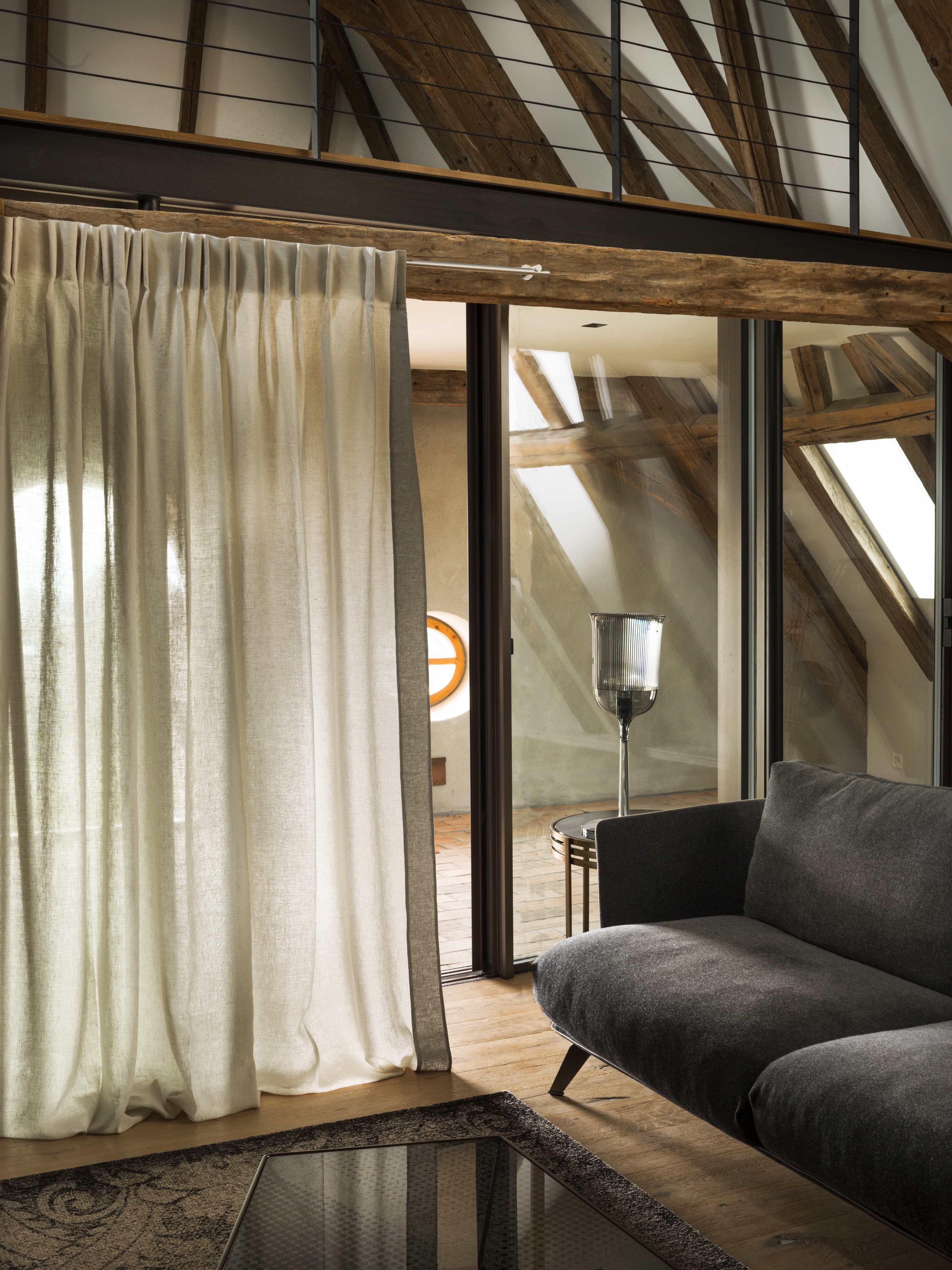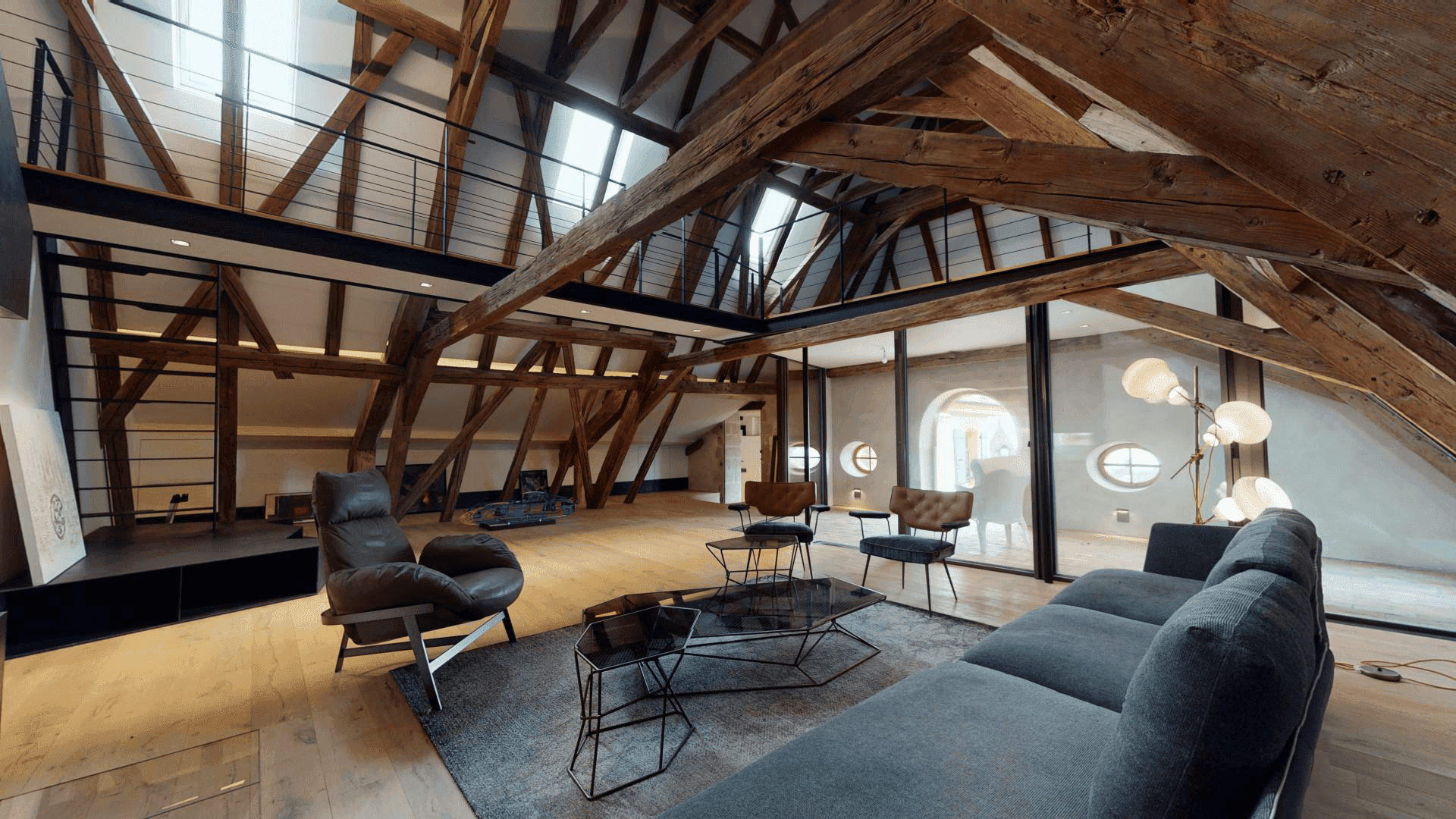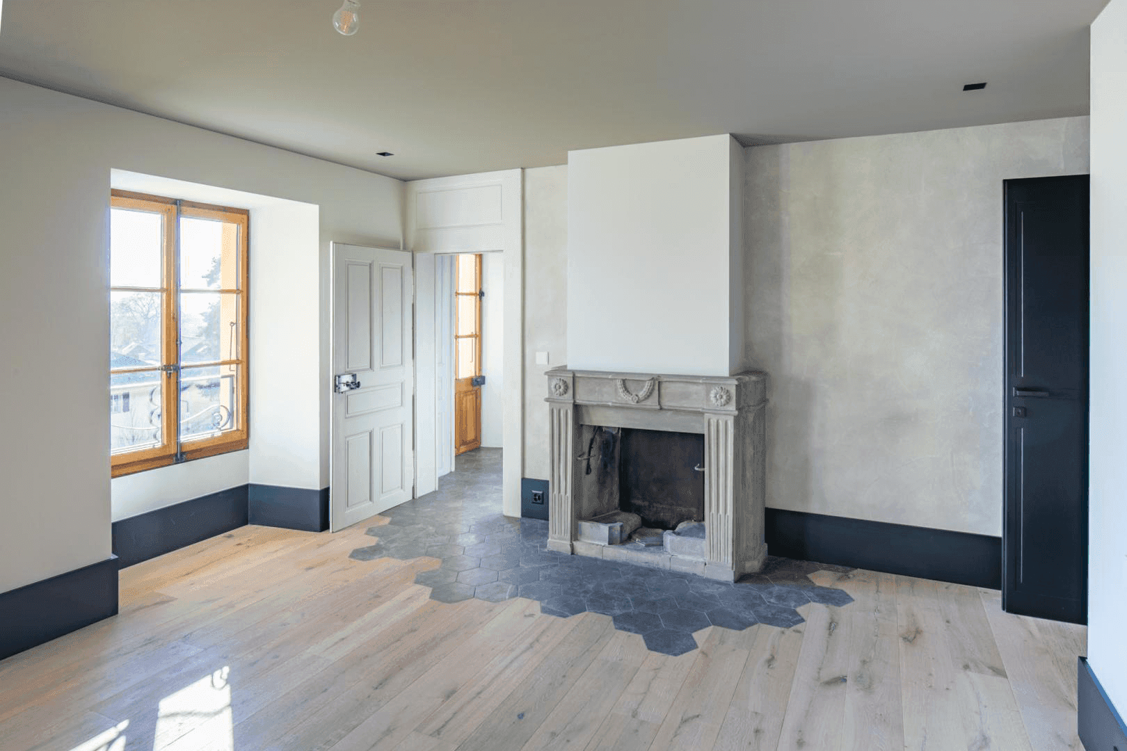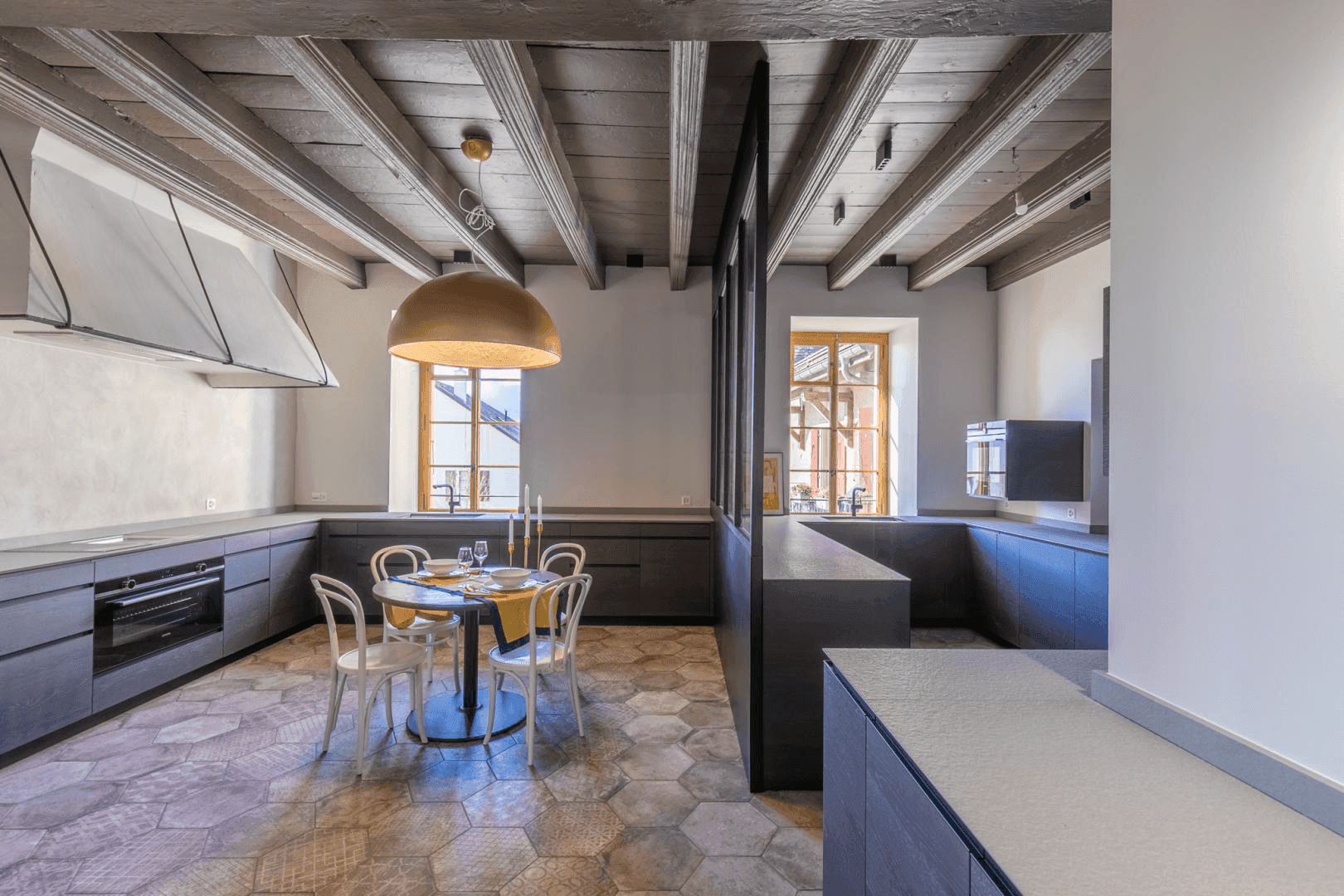 Le Manoir Begnins Rénovation complète d'un bâtiment datant de 1306, transformé en trois appartements distincts tout en préservant l'architecture d'origine. Pierres taillées, poutres anciennes, cheminées sculptées et dallages historiques coexistent avec des interventions résolument contemporaines. Les espaces de vie jouent sur ce dialogue : charpentes massives apparentes et menuiseries en acier noir, cuisines laquées blanc immaculé ou façades en noyer américain contrastant avec les carrelages, enduits à la chaux et parquet chêne clair.