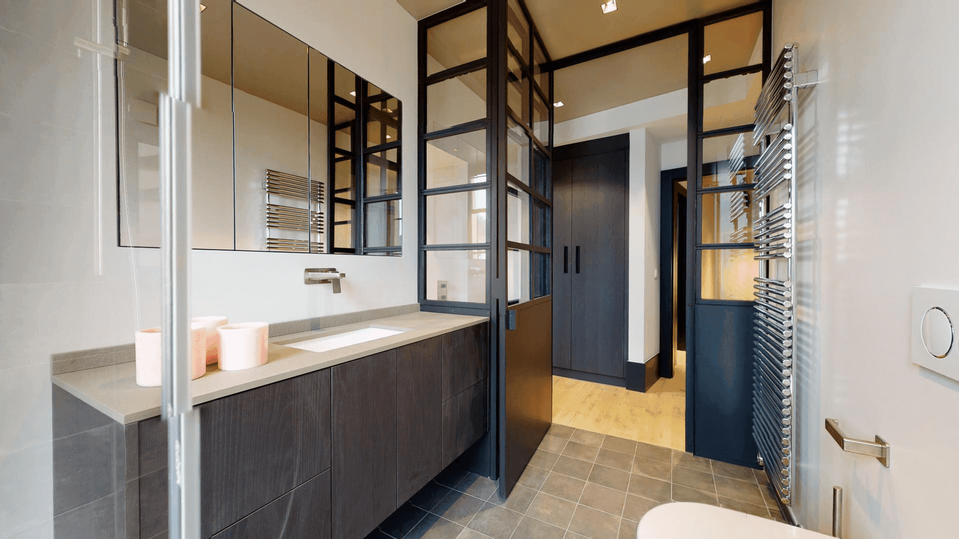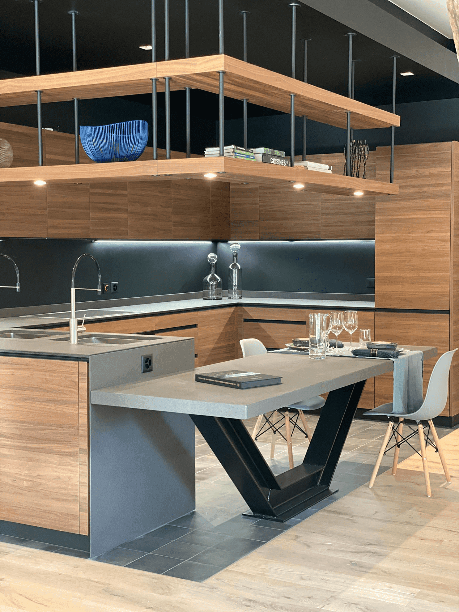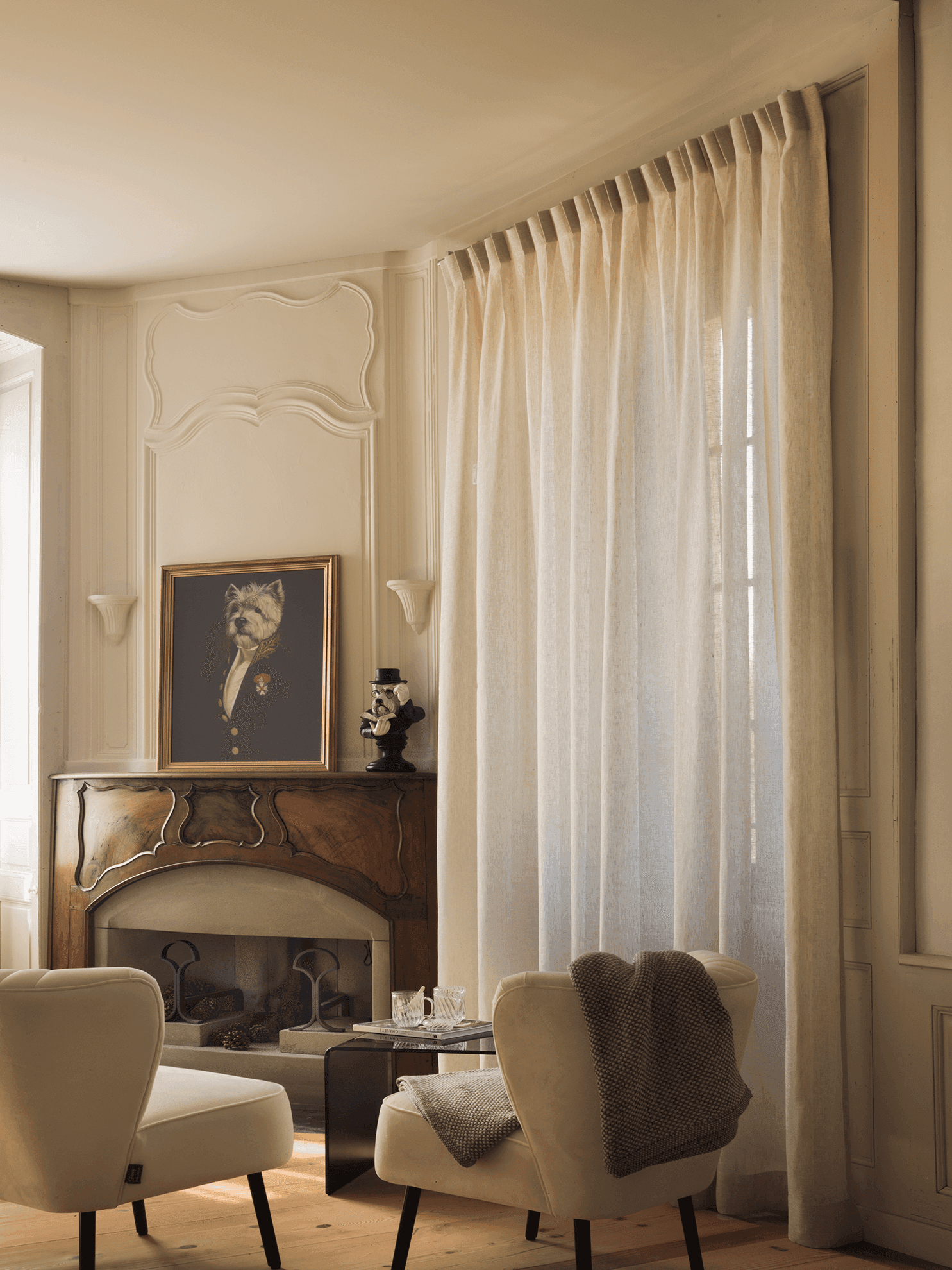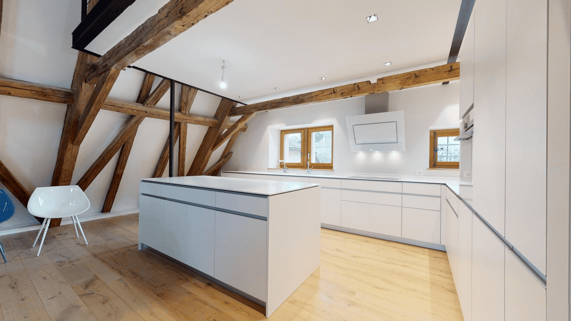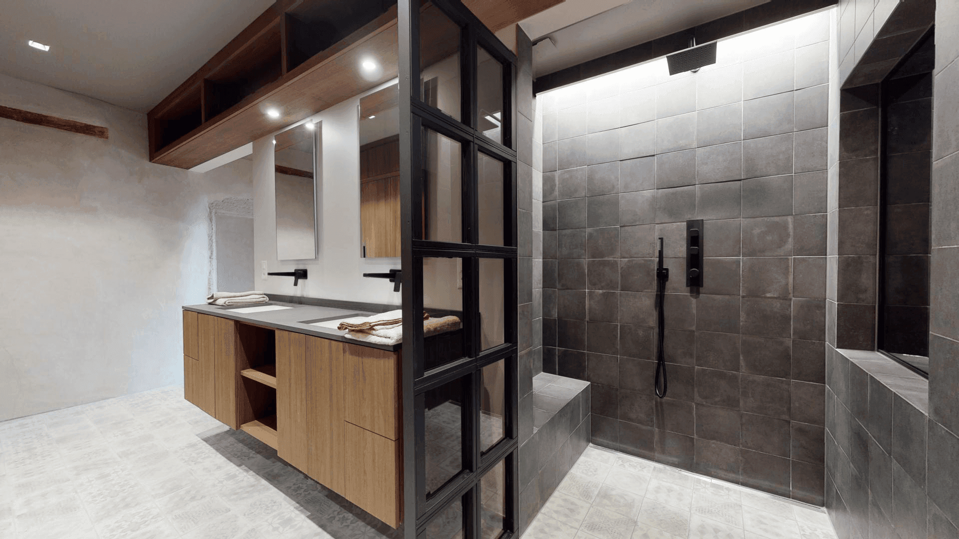 Le Manoir Begnins Rénovation complète d'un bâtiment datant de 1306, transformé en trois appartements distincts tout en préservant l'architecture d'origine. Pierres taillées, poutres anciennes, cheminées sculptées et dallages historiques coexistent avec des interventions résolument contemporaines. Les espaces de vie jouent sur ce dialogue : charpentes massives apparentes et menuiseries en acier noir, cuisines laquées blanc immaculé ou façades en noyer américain contrastant avec les carrelages, enduits à la chaux et parquet chêne clair.