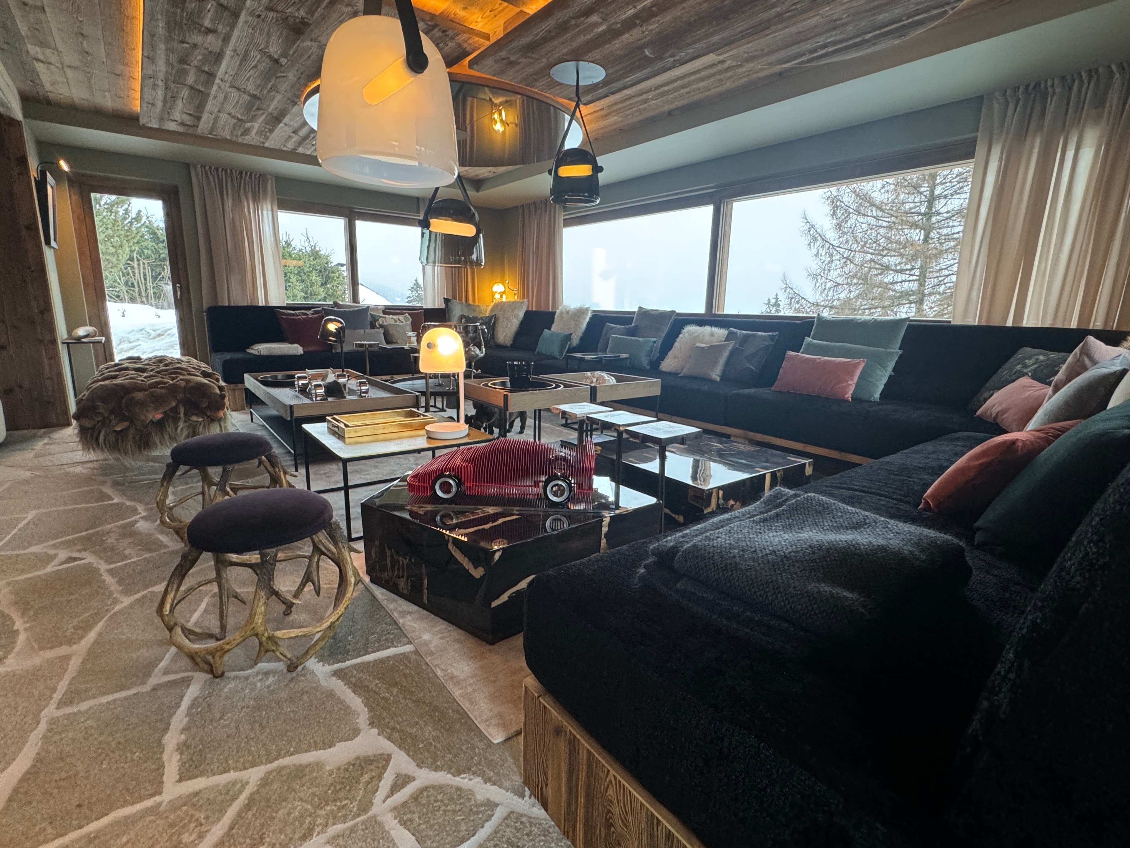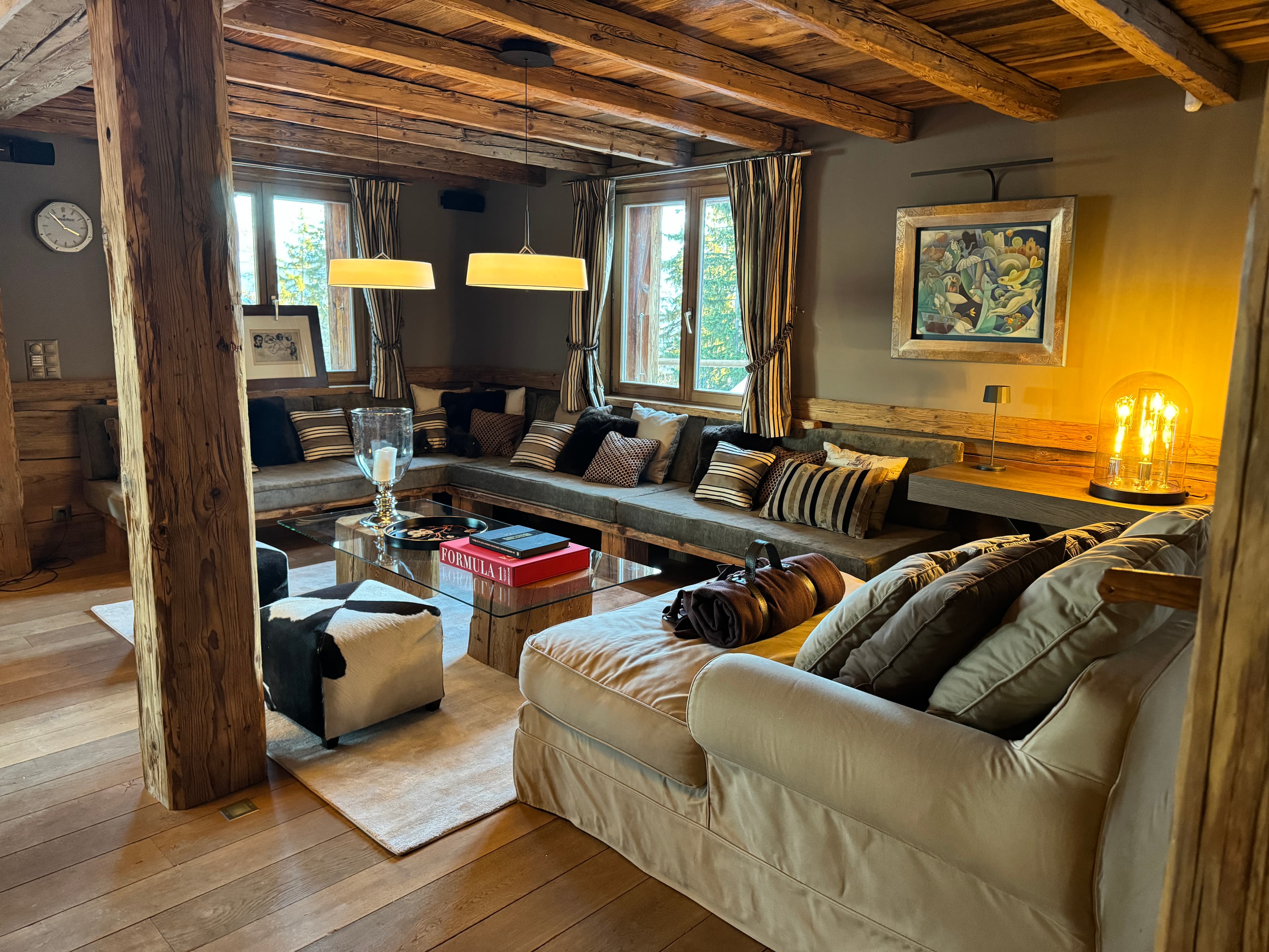Chalet Kadelpapéo Plusieurs niveaux, plusieurs ambiances, le chalet se déploie comme un récit. Vieux bois et charpente apparente posent le cadre ; le mobilier de créateur, les œuvres d'art et un flipper vintage en font autre chose. Le rez-de-chaussée s'organise en espaces fluides : cuisine ouverte sur la salle à manger, salon, salon TV et véranda suite à un aggrandissement. Chaque niveau développe ensuite sa propre atmosphère, des chambres aux murs rouge bordeaux et boiseries d'époque qui jouent la carte du chalet traditionnel assumé. Les détails contemporains ponctuent l'ensemble sans jamais effacer l'âme du lieu.