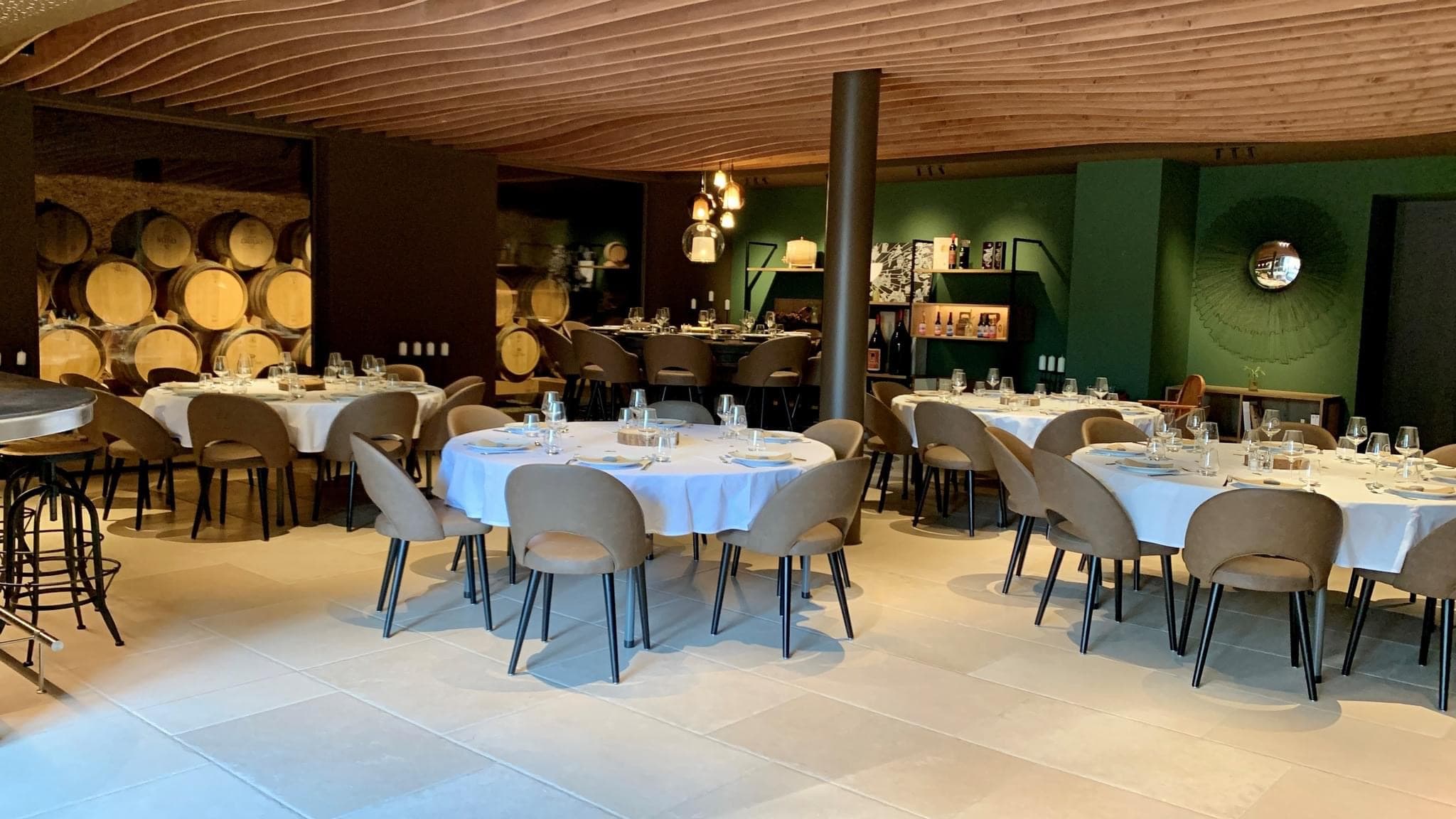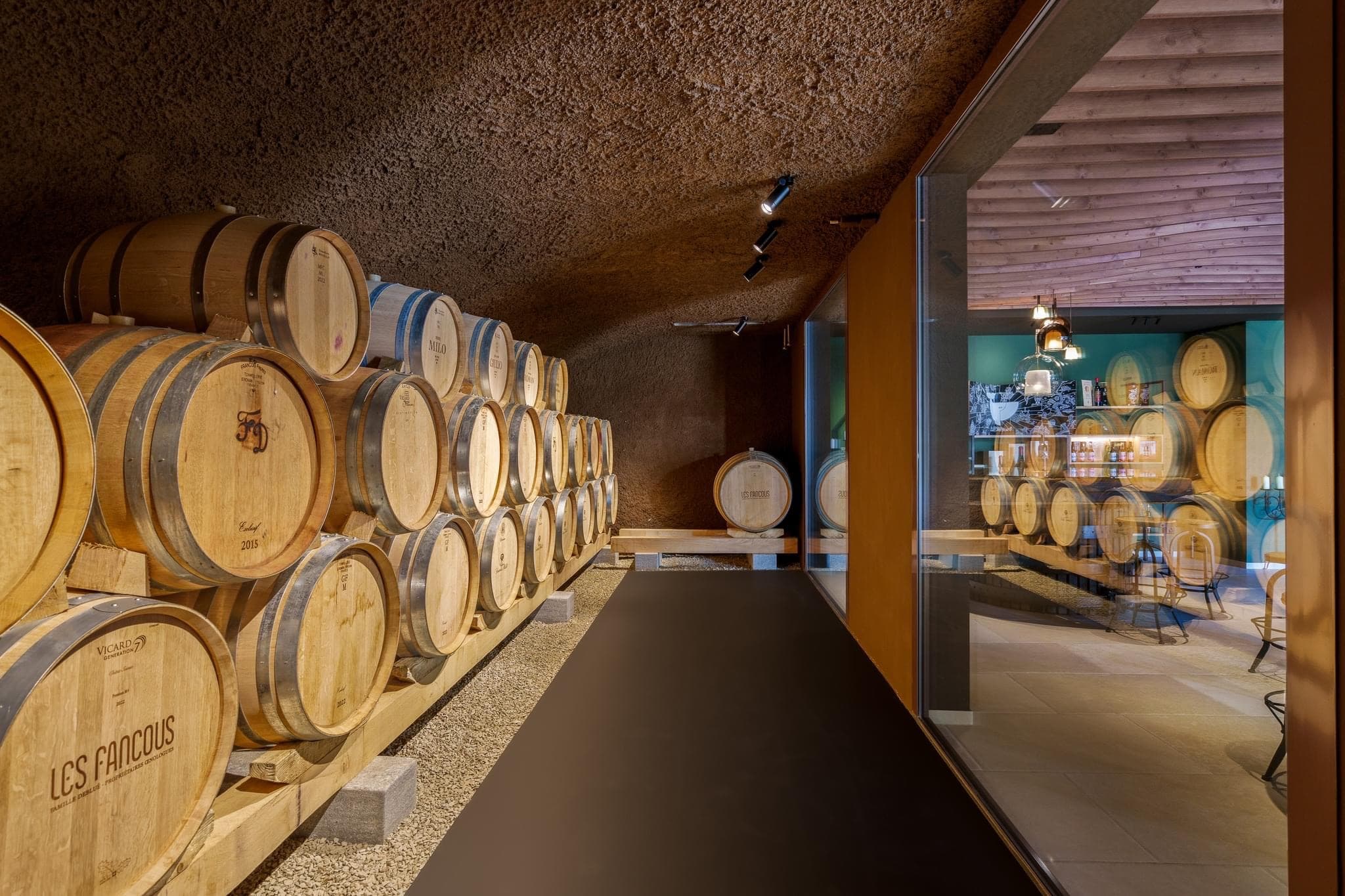 Domaine Debluë Aménagement intérieur d'un carnozet. Au cœur du domaine, l'espace de dégustation et de restauration s'articule autour du vert bouteille, couleur signature qui habille le bar, les murs et les étagères d'exposition. Un plafond en lames de bois cintrées court sur l'ensemble et unifie les volumes. La cave à barriques, visible depuis la salle par une paroi vitrée, s'intègre au décor comme un élément à part entière. Les parois vitrées en fait un élément central, rappelant en permanence l'origine du lieu. Les détails racontent l'identité du domaine : un pressoir ancien reconverti en table de dégustation, une auge en pierre brute transformée en vasque, des suspensions en verre soufflé. Ancien et contemporain s'y côtoient sans artifice.
